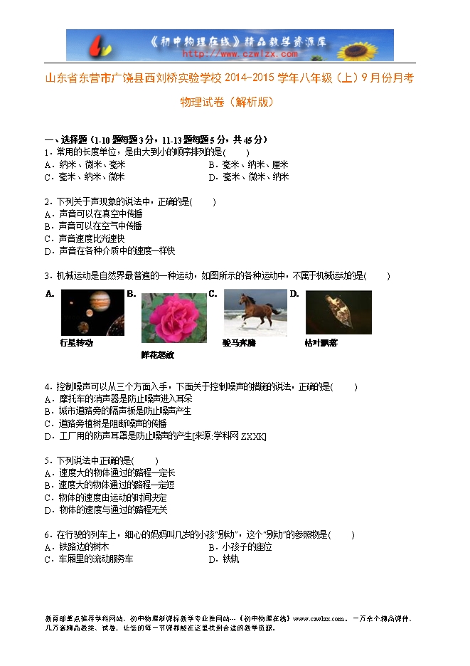 山东省东营市广饶县西刘桥实验学校2014-2015学年八年级(上)9月份月考物理试卷(解析版)