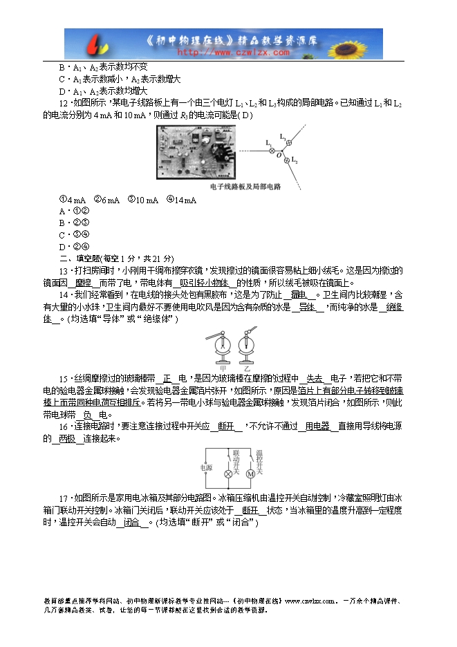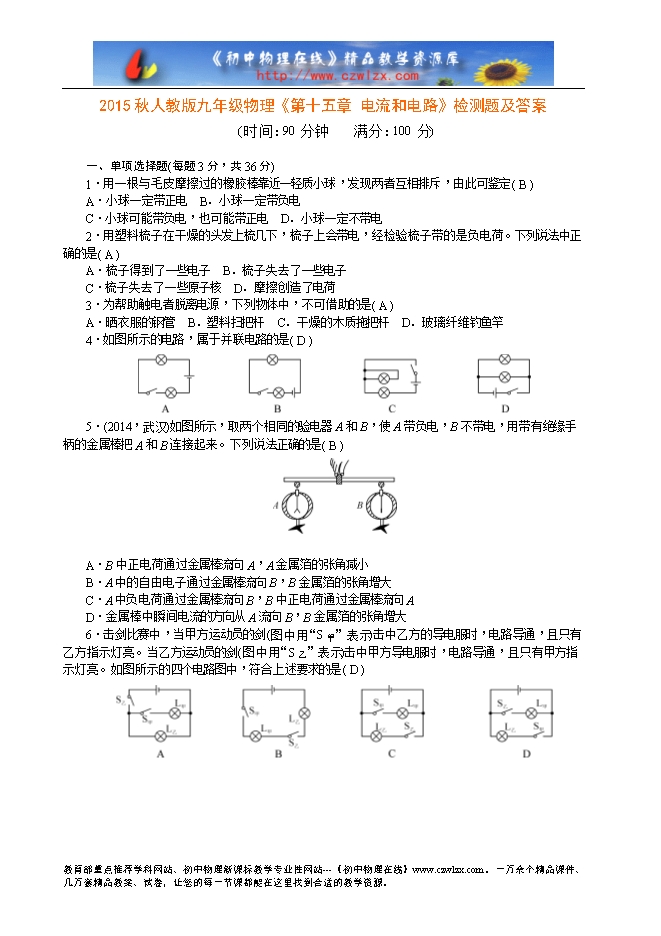 2015秋人教版九年级物理《第十五章 电流和电路》检测题及答案