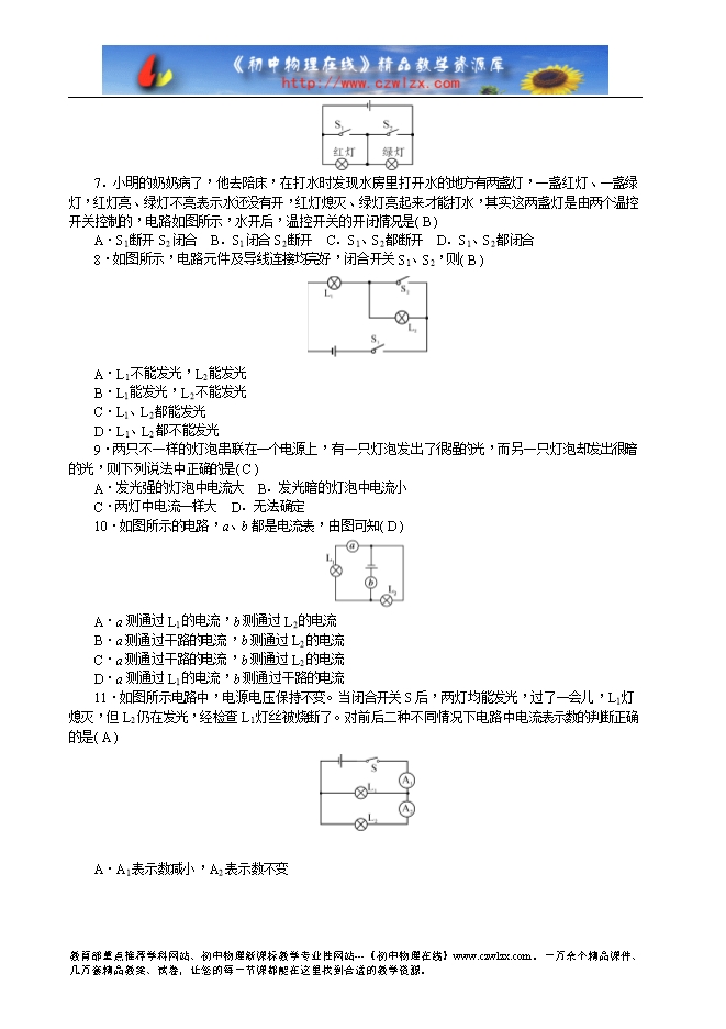6.击剑比赛中,当甲方运动员的剑(图中用“S甲”表示)击中乙方的导电服时,电路导通,且只有乙方指示灯亮。当乙方运动员的剑(图中用“S乙”表示)击中甲方导电服时,电路导通,且只有甲方指示灯亮。如图所示的四个电路图中,符合上述要求的是( D )