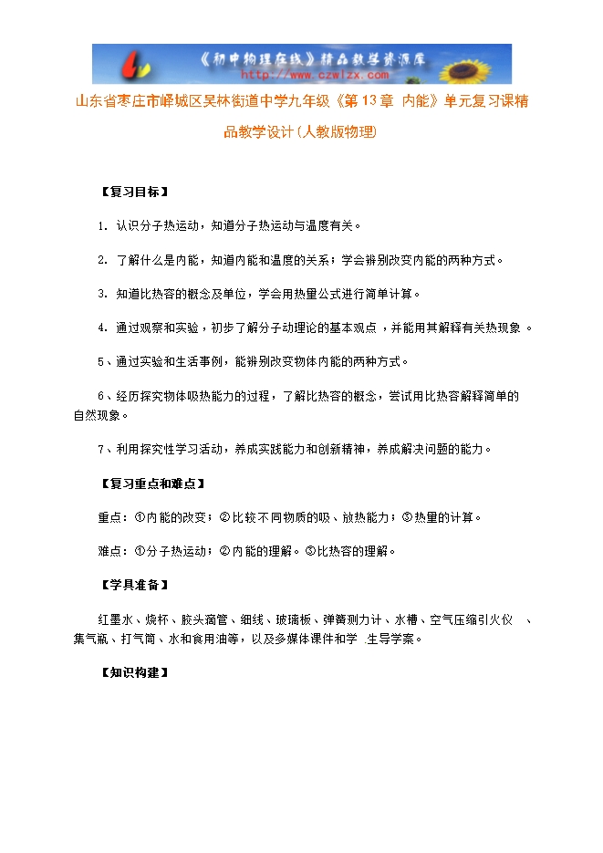 山东省枣庄市峄城区吴林街道中学九年级《第13章 内能》单元复习课精品教学设计(人教版物理)