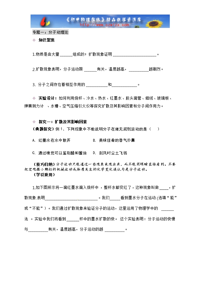 ? 实验设计:如何利用烧杯、冷水、热水、红墨水、胶头滴管、细线、玻璃板、弹簧测力计 、水槽、空气压缩引火仪等探究扩散及其影响因素和分子间作用力。