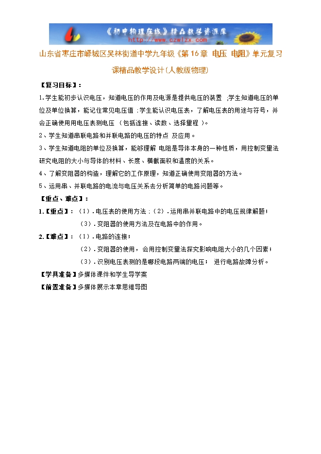 山东省枣庄市峄城区吴林街道中学九年级《第16章 电压 电阻》单元复习课精品教学设计(人教版物理)