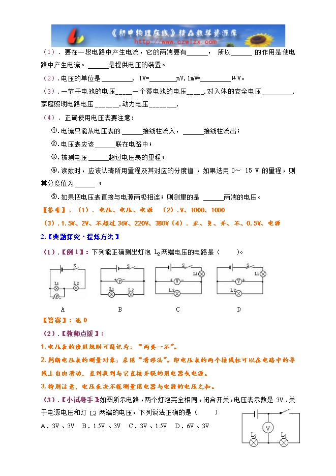 1.学生能初步认识电压,知道电压的作用及电源是提供电压的装置;学生知道电压的单位及单位换算,能记住常见电压值;学生能认识电压表,了解电压表的用途与符号,并会正确使用用电压表测电压(包括连接、读数、选择量程)。