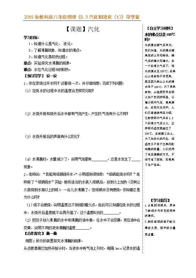 2015秋教科版八年级物理《5.3汽化和液化(1)》导学案