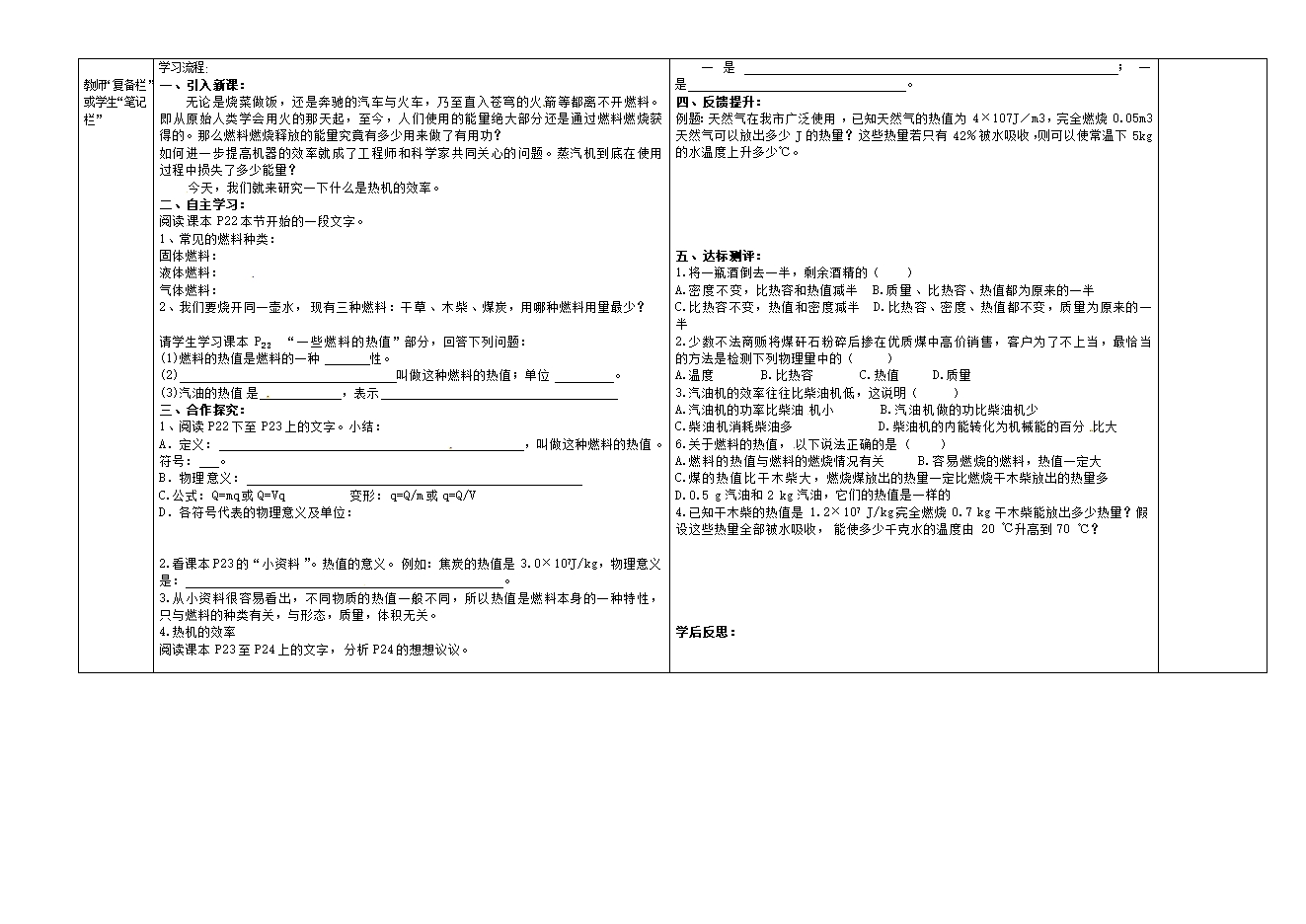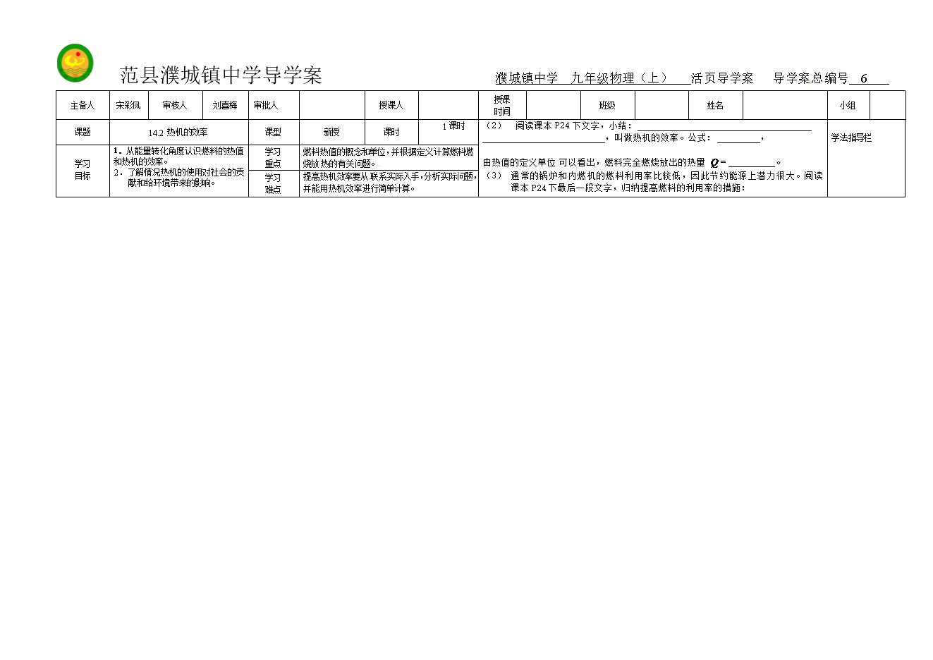 河南省濮阳市范县濮城镇中学2016届九年级物理上册导学案:14.2热机的效率