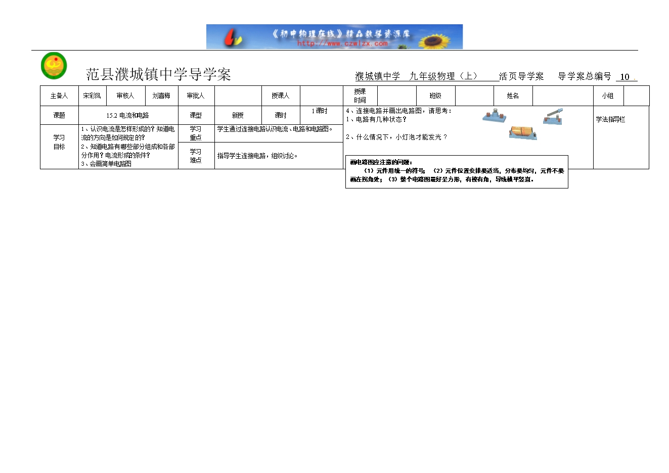 河南省濮阳市范县濮城镇中学2016届九年级物理上册导学案:15.2电流和电路