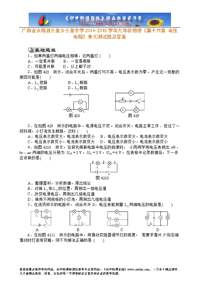 广西省永福县三皇乡三皇中学2014-2015学年九年级物理《第十六章 电压 电阻》单元测试题及答案