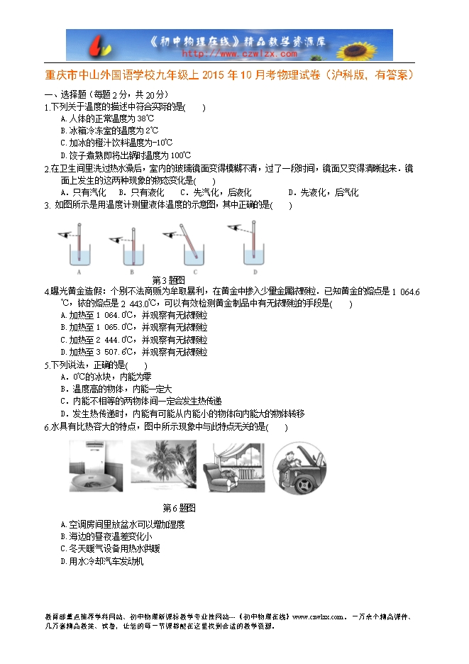 重庆市中山外国语学校九年级上2015年10月考物理试卷(沪科版,有答案)