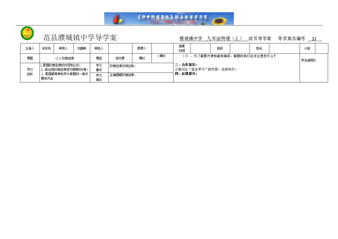 河南省濮阳市范县濮城镇中学2016届九年级物理上册导学案:17.2欧姆定律