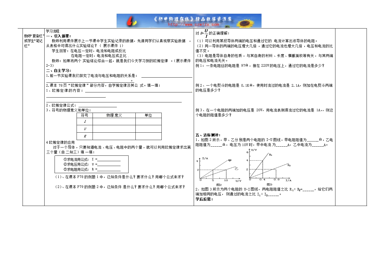 2.课本78页“欧姆定律”部分内容,自学姆定律及其公 式。填一填: