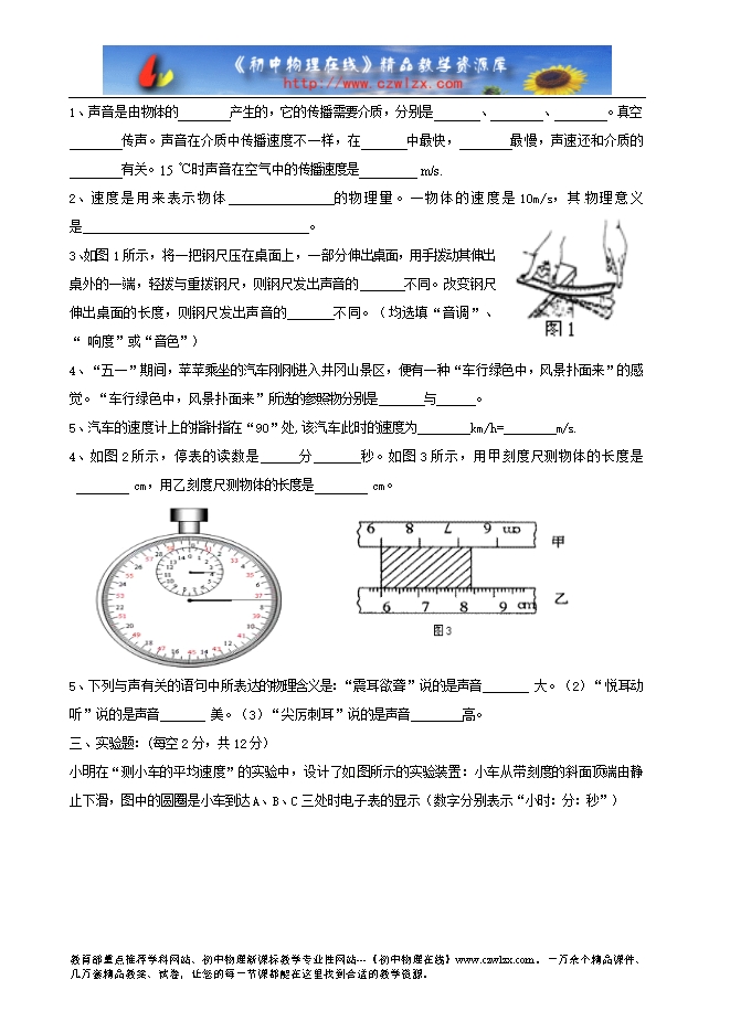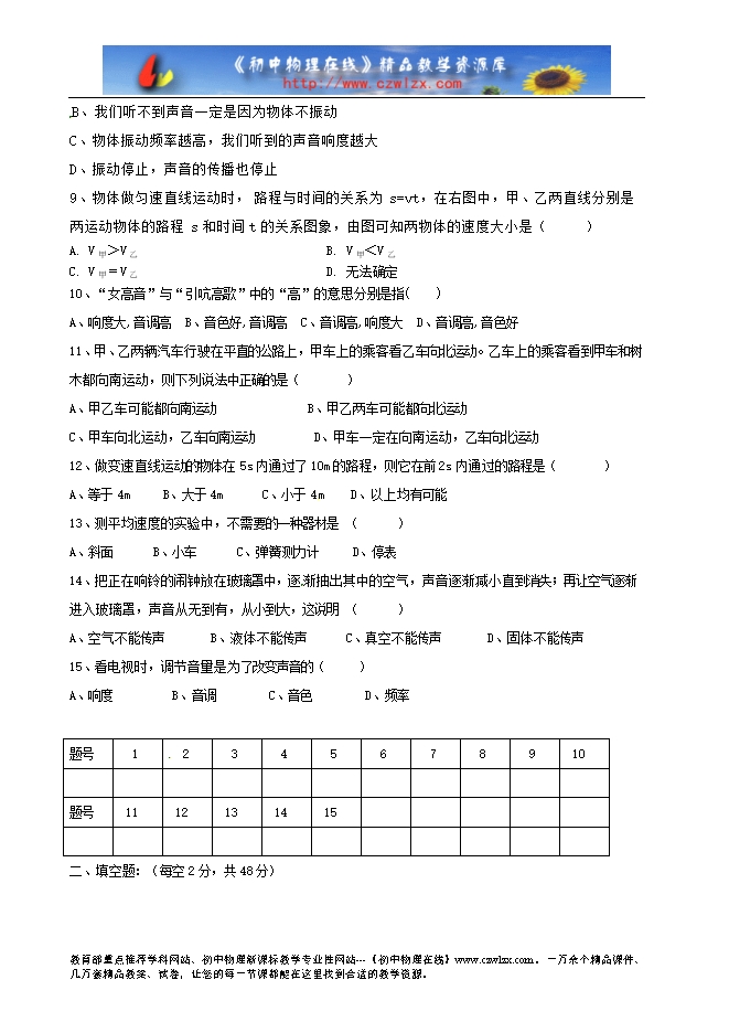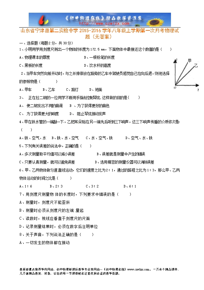 山东省宁津县第二实验中学2015-2016学年八年级上学期第一次月考物理试题(无答案)
