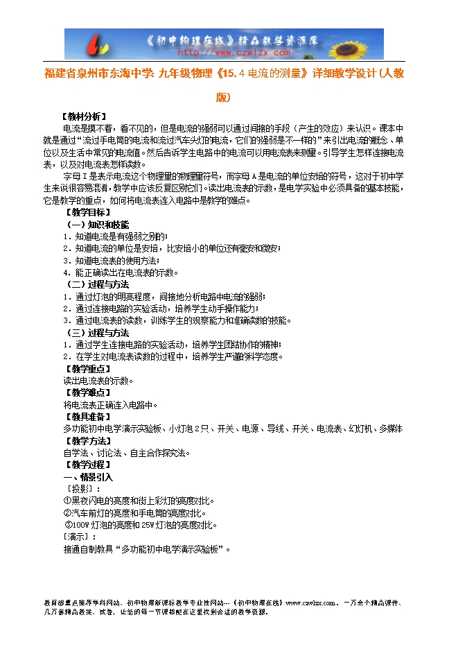 福建省泉州市东海中学:九年级物理《15.4电流的测量》详细教学设计(人教版)