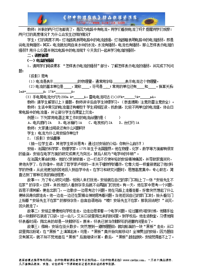 电流是摸不着,看不见的,但是电流的强弱可以通过间接的手段(产生的效应)来认识。课本中就是通过“流过手电筒的电流和流过汽车头灯的电流,它们的强弱是不一样的”来引出电流的概念、单位以及生活中常见的电流值。然后告诉学生电路中的电流可以用电流表来测量。引导学生怎样连接电流表,以及对电流表怎样读数。