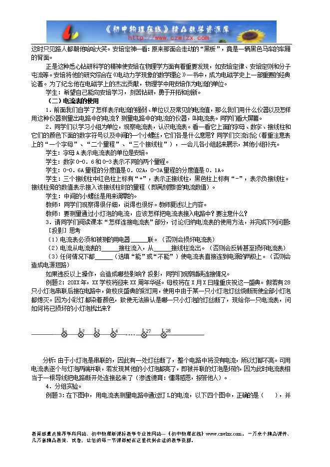字 母I是表示电流这个物理量的物理量符号,而字母A是电流的单位安培的符号,这对于初中学生来说很容易混淆,教学中应该反复区别它们。读出电流表的示数,是电学实验中必须具备的基本技能,它是教学的重点,如何将电流表连入电路中是教学的难点。