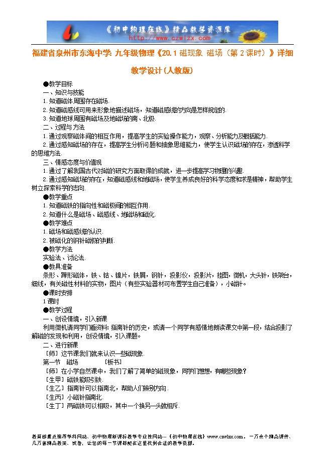 福建省泉州市东海中学:九年级物理《20.1磁现象 磁场(第2课时)》详细教学设计(人教版)