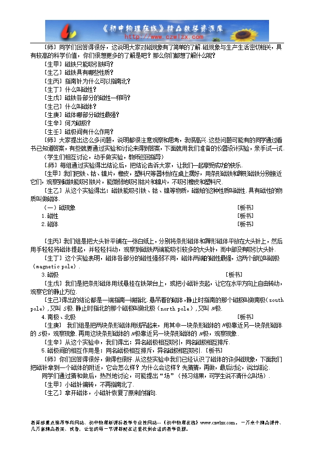 [师]在小学自然课中,我们了解了简单的磁现象,同学们想想,有哪些现象?