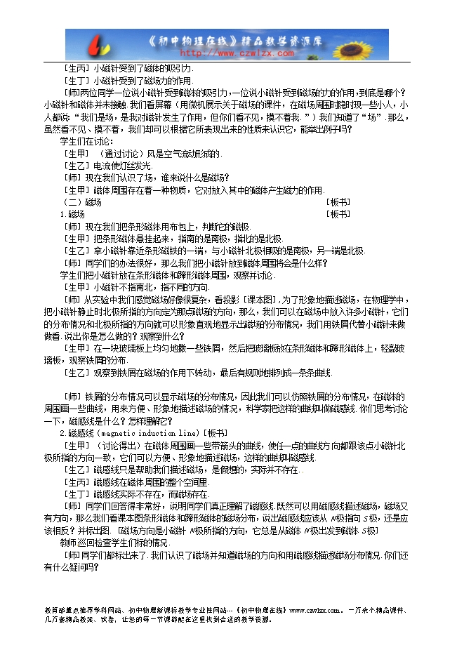 2.通过感知磁场的存在,提高学生分析问 题和抽象思维能力,使学生认识磁场的存在,渗透科学的思维方法.