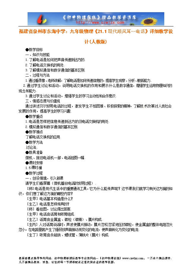 福建省泉州市东海中学:九年级物理《21.1现代顺风耳--电话》详细教学设计(人教版)