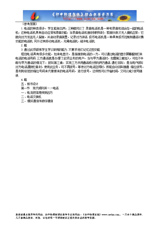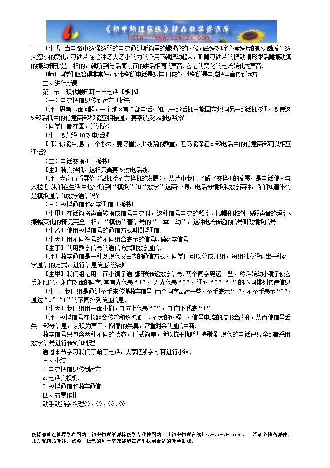 1.通过看录像、老师讲解,了解电话是如何传递信息的,提高学生观察、分析、概括能力.[来源:学。科。网]2.通过学生讨论和活动,说明电话交换机的作用和展示什么是数字通信,增强学生运用物理知识的观念和能力.