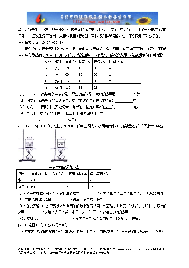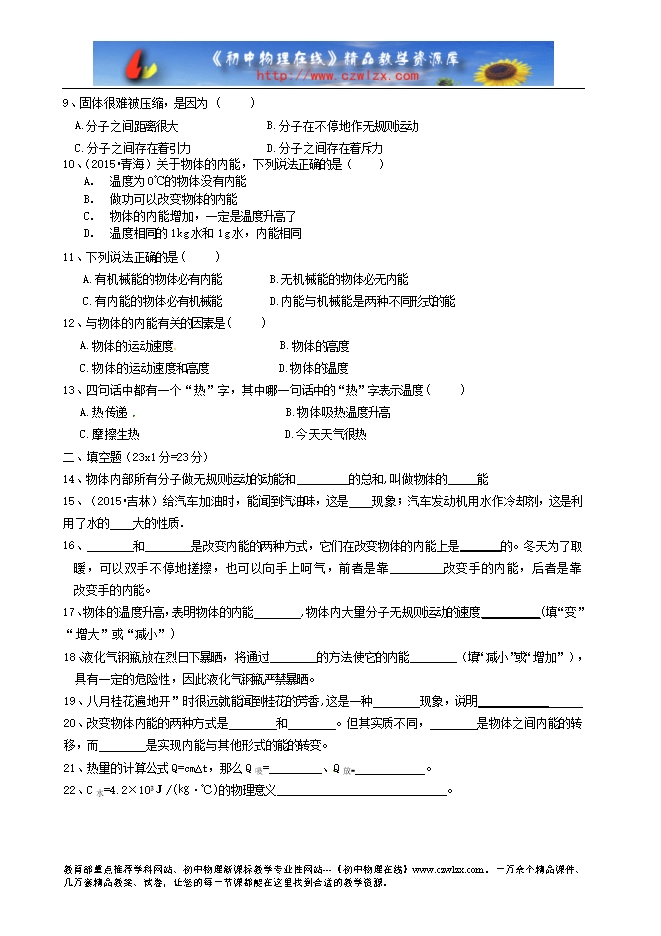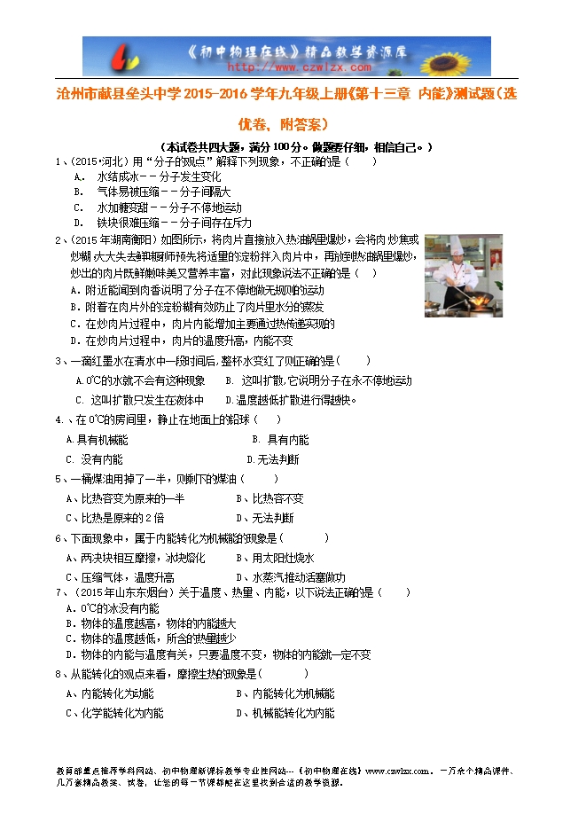 沧州市献县垒头中学2015-2016学年九年级上册《第十三章 内能》测试题(选优卷,附答案)