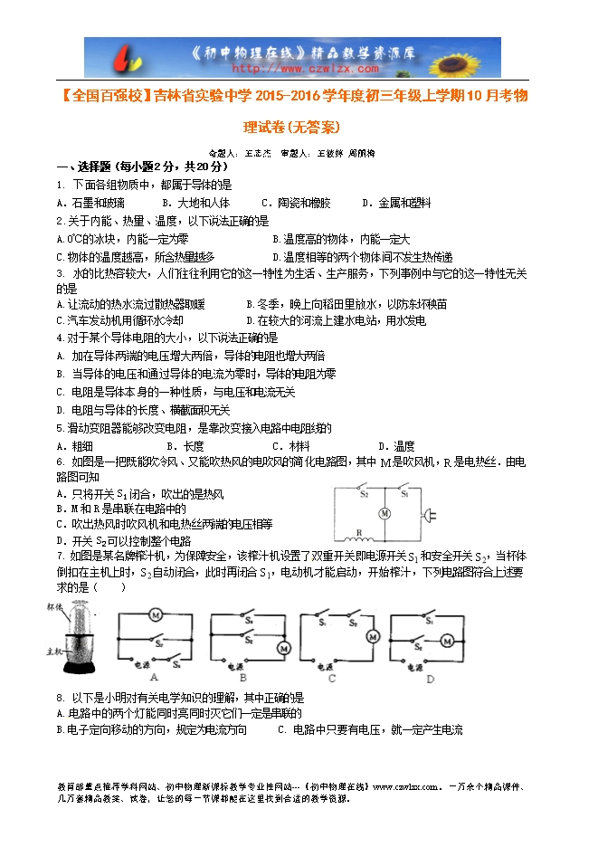 【全国百强校】吉林省实验中学2015-2016学年度初三年级上学期10月考物理试卷(无答案)