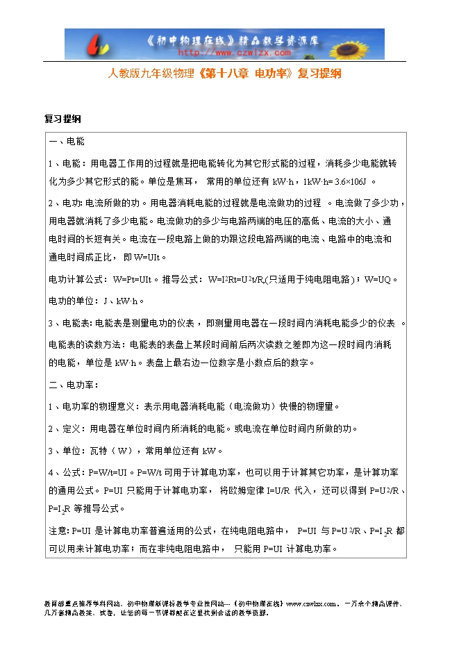 4、公式:P=W/t=UI。P=W/t可用于计算电功率,也可以用于计算其它功率,是计算功率的通用公式。P=UI只能用于计算电功率,将欧姆定律I=U/R代入,还可以得到P=U2/R、P=I2R等推导公式。