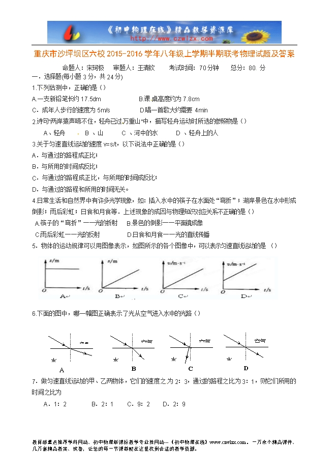 重庆市沙坪坝区六校2015-2016学年八年级上学期半期联考物理试题及答案(沪科版)