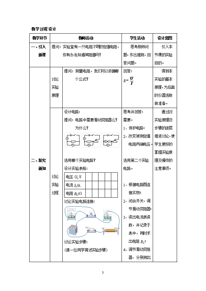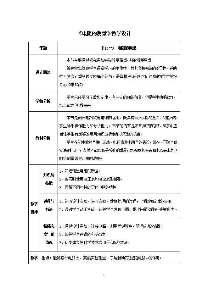 人教版九年级物理全册同步教案:第17章 欧姆定律 第3节 电阻的测量
