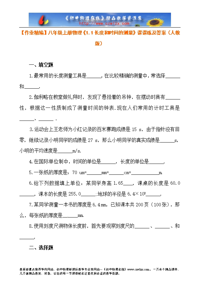 【作业精编】八年级上册物理《1.1长度和时间的测量》课课练及答案(人教版)
