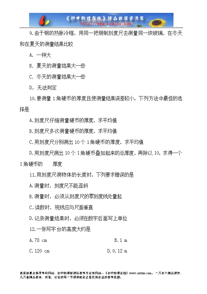9.由于钢的热胀冷缩,用同一把钢制刻度尺去测量同一块玻璃,在冬天和在夏天的测量结果比较