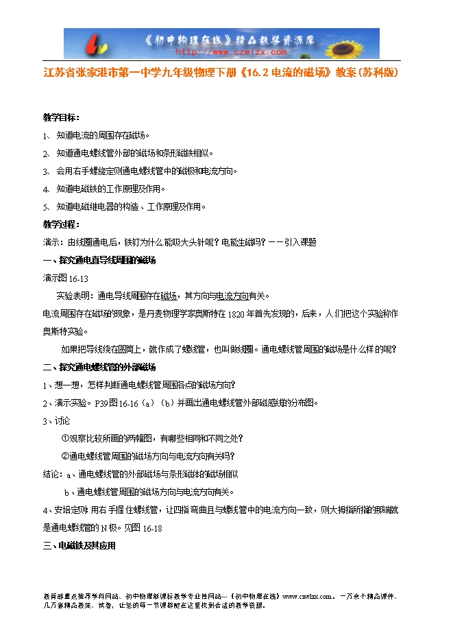 江苏省张家港市第一中学九年级物理下册《16.2电流的磁场》教案(苏科版)