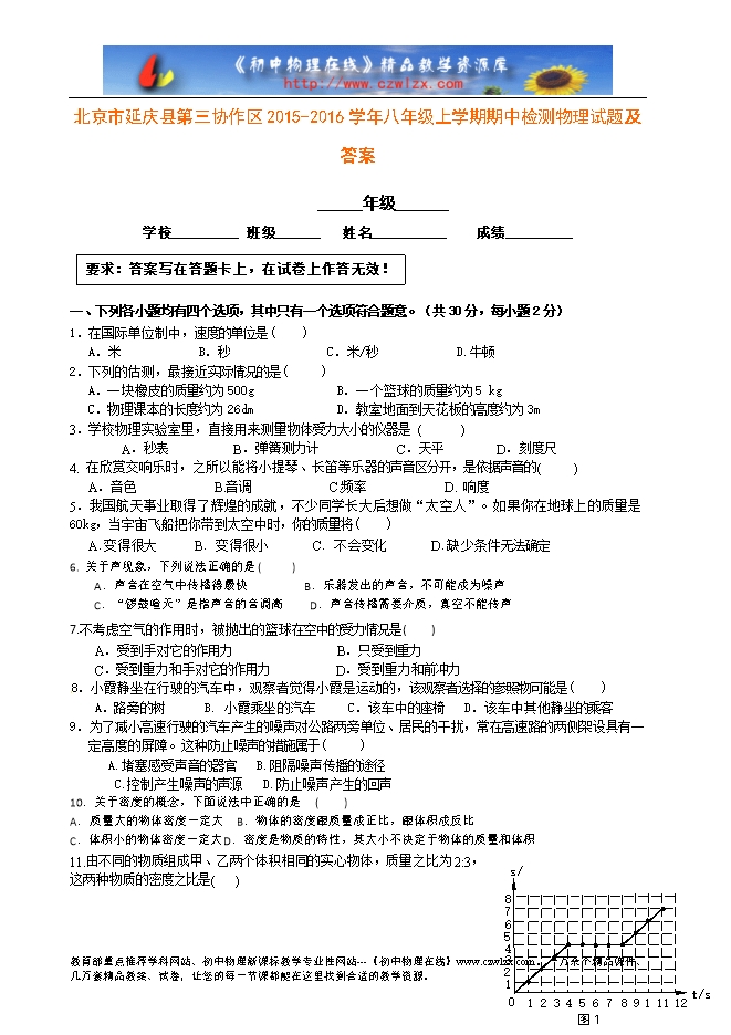 北京市延庆县第三协作区2015-2016学年八年级上学期期中检测物理试题及答案