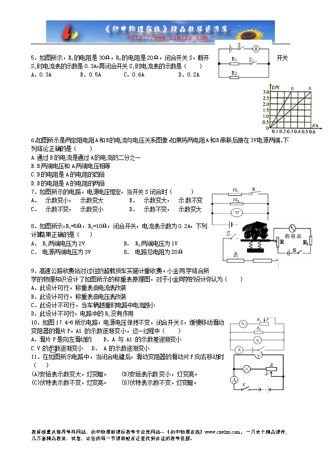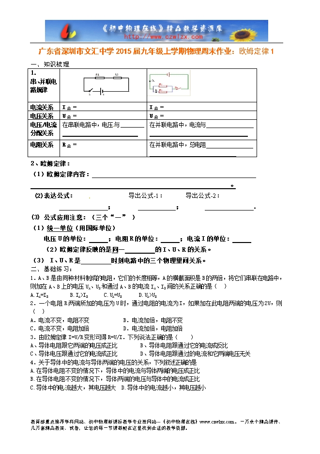 广东省深圳市文汇中学2015届九年级上学期物理周末作业:欧姆定律1