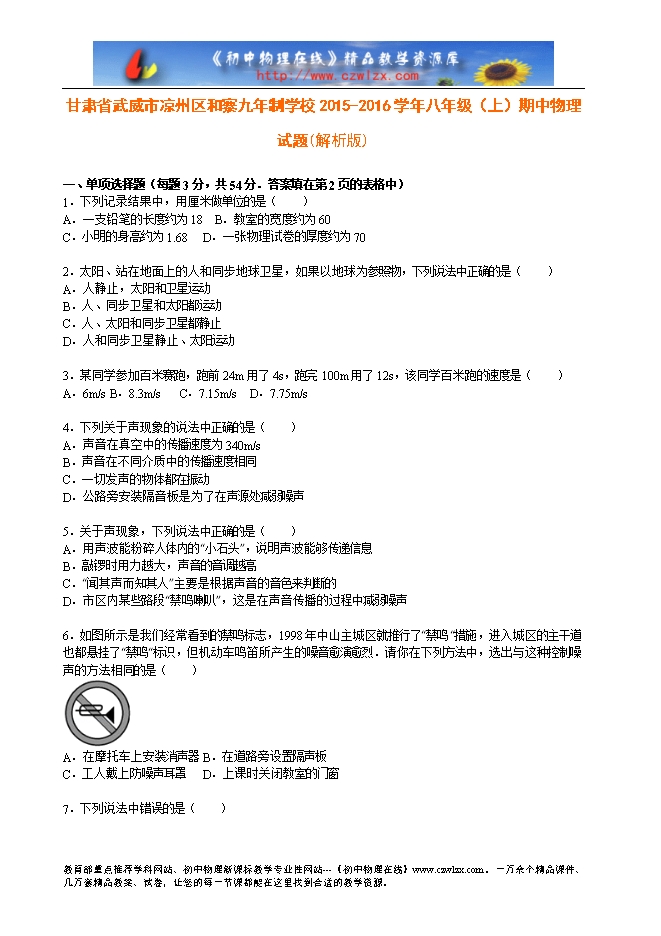 甘肃省武威市凉州区和寨九年制学校2015-2016学年八年级(上)期中物理试题(解析版)