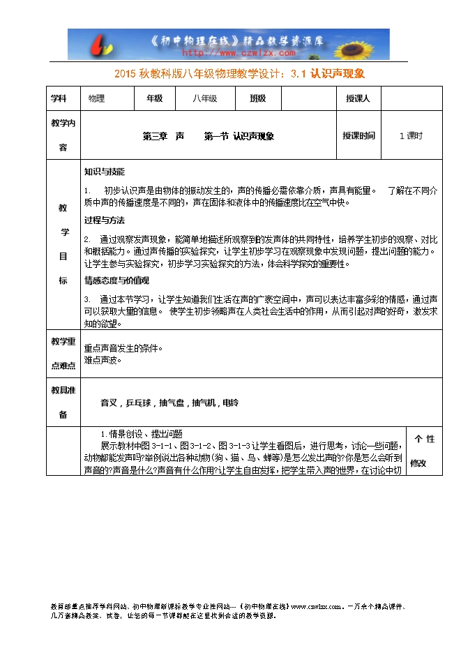 2015秋教科版八年级物理教学设计:3.1认识声现象