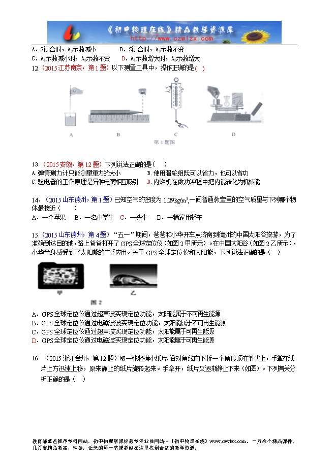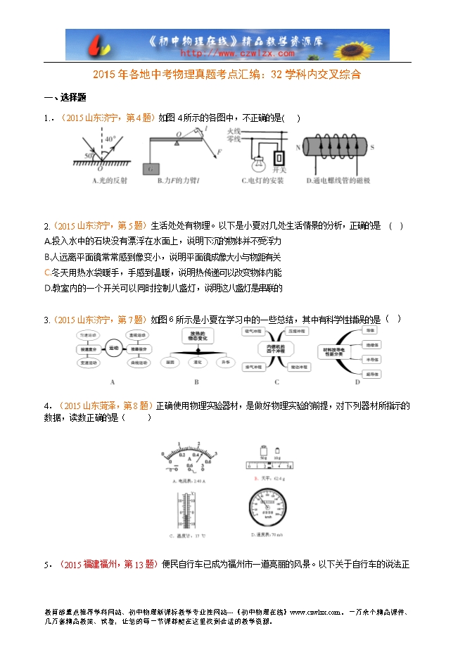 2015年各地中考物理真题考点汇编:32学科内交叉综合