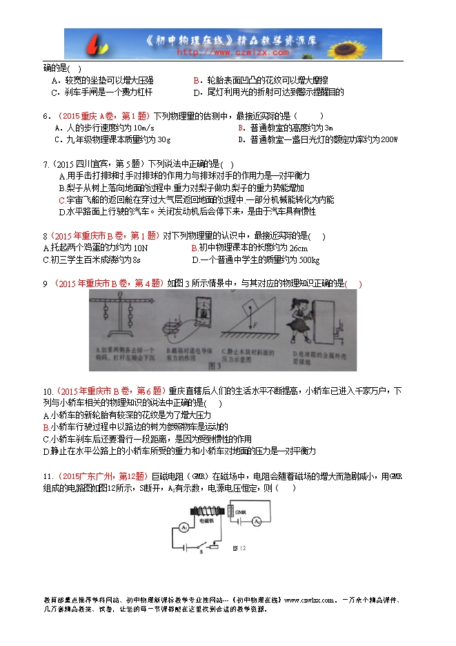 6.(2015重庆A卷,第1题)下列物理量的估测中,最接近实际的是( )