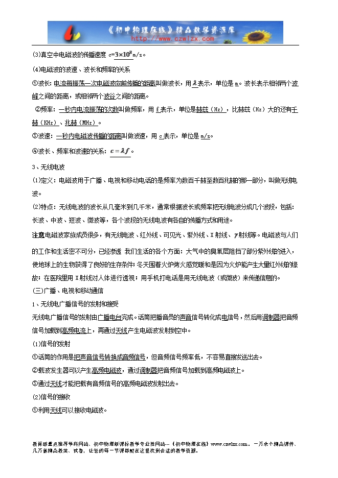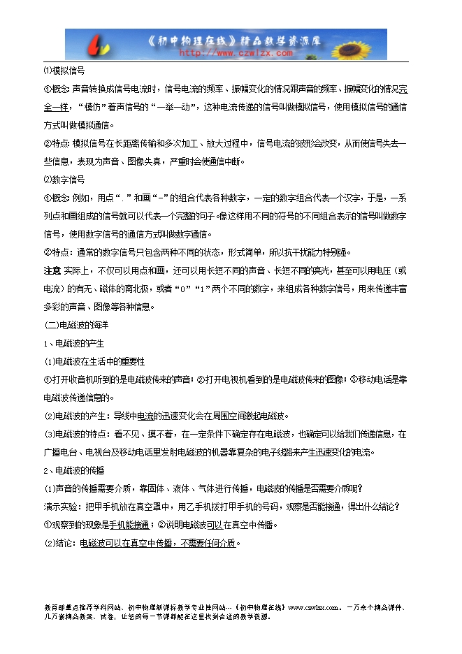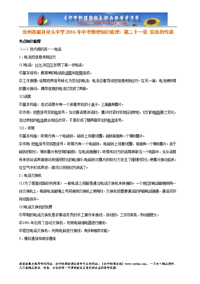沧州市献县垒头中学2016年中考物理知识梳理:第二十一章 信息的传递