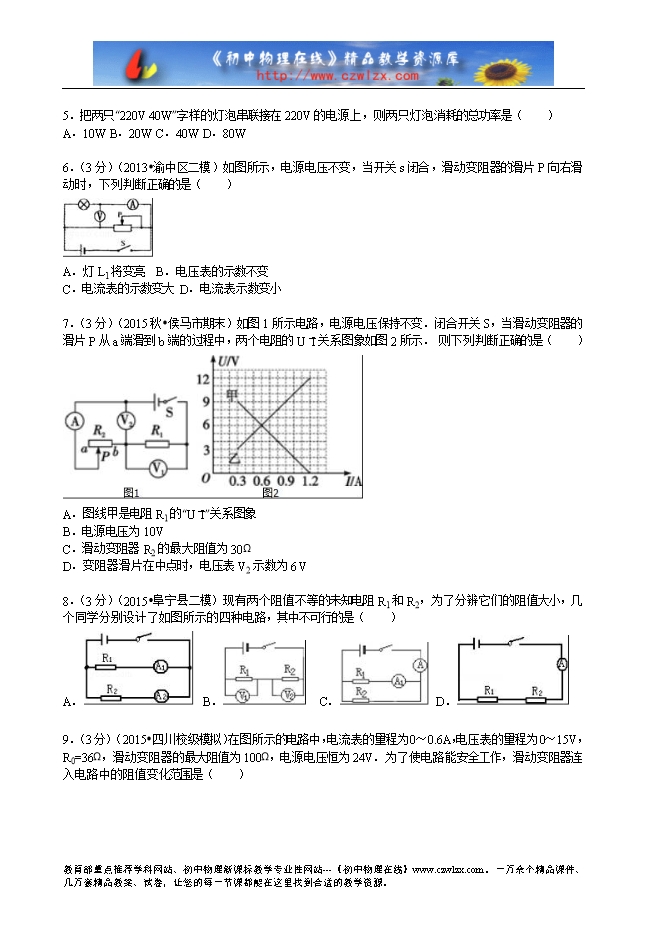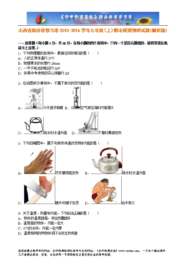 山西省临汾市侯马市2015-2016学年九年级(上)期末模拟物理试题(解析版)