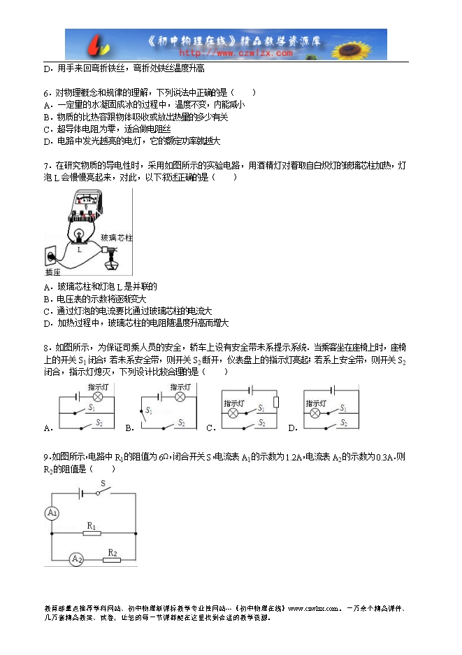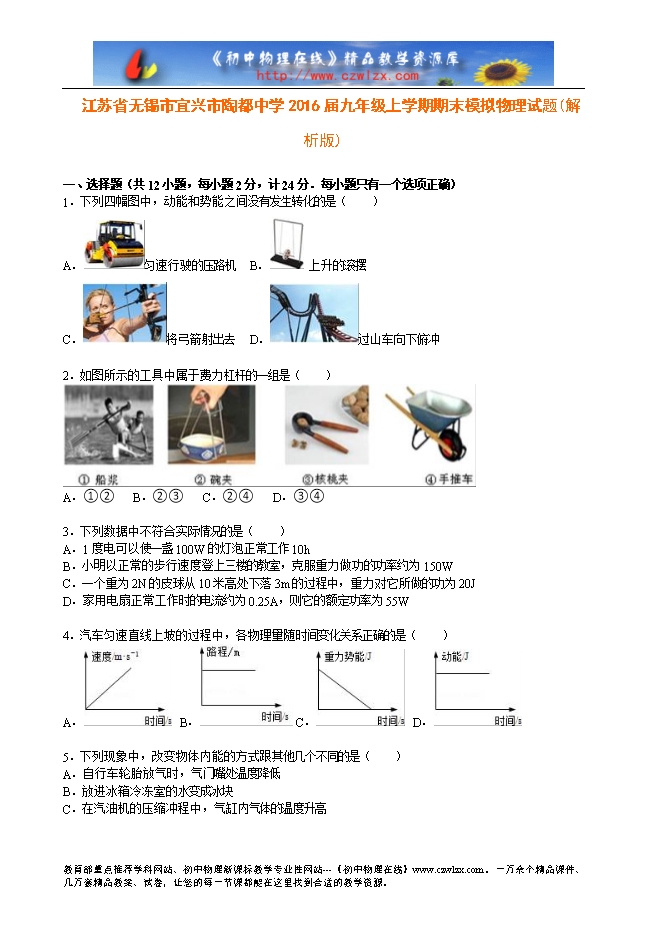江苏省无锡市宜兴市陶都中学2016届九年级上学期期末模拟物理试题(解析版)