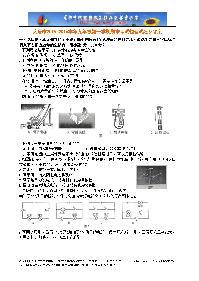 太原市2015-2016学年九年级第一学期期末考试物理试题及答案