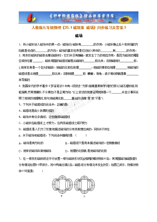 7.在 一根条形磁铁附近平行放置一根与磁铁形状完全相同的棒状物体XY后,其周围磁场磁感线的 分布情况如 图9-5甲所示.将XY两端对调以后,磁感 线分布情况未发生改变,如图乙所示.则棒状物体X Y可能是( )