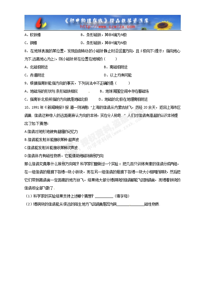 3.地球本身是一个巨大的磁体,地磁的北极在地 理 ,地磁的南极在地理 .地磁场的磁感线是从地理 极出来,回到地理 极. 鳗鲡、海龟、鸽子等动物就是靠 来导航的.
