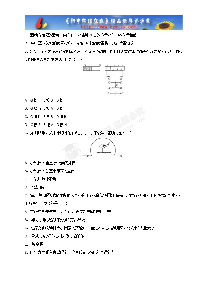 5.如图所示,为使滑动变阻器的滑片P向右移动时,通电螺线管对条形磁铁的 斥力变大,则电源和变阻器接人电路的方式可以是( )