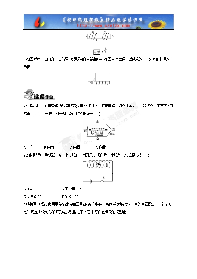 7.玩具小船上固定有螺线管(有铁芯)、电源和开关组成的电路,如图所示,把小船按图示的方向放在水面上,闭合开关,船头最后静止时的指向是( )