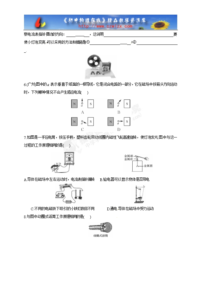 5.如图是实验室用的手摇发电机,在发电机和小灯泡的电路里串联一个电流表,缓慢转动线圈,观察电流表指针摆动的方向:_____ ___,这说明_______________________________________.要使小灯泡 变亮 ,可以采用的方法和措施是:①___________________ ;②________________________.