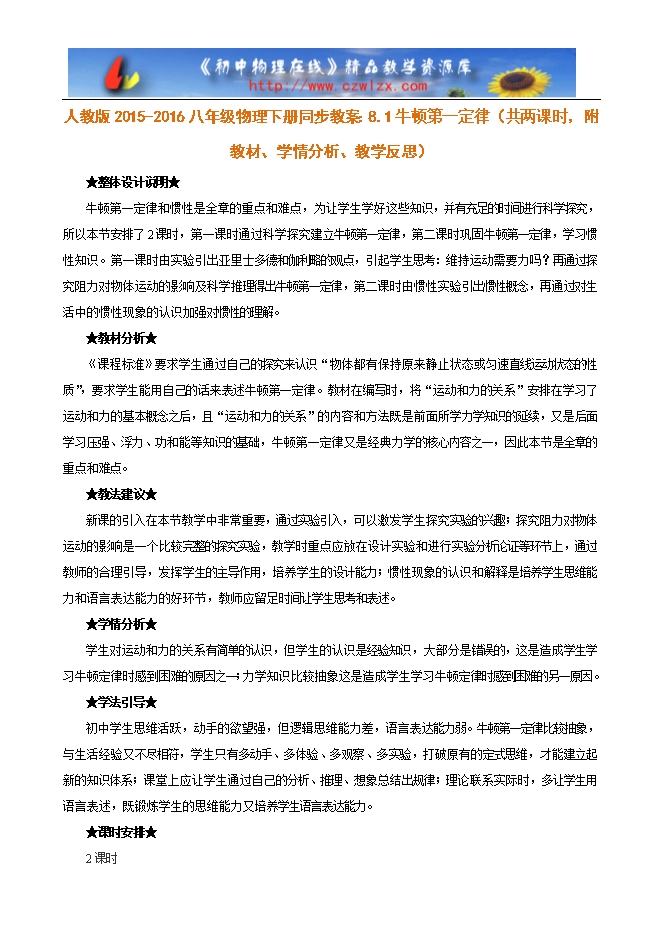 人教版2015-2016八年级物理下册同步教案:8.1牛顿第一定律(共两课时,附教材、学情分析、教学反思)