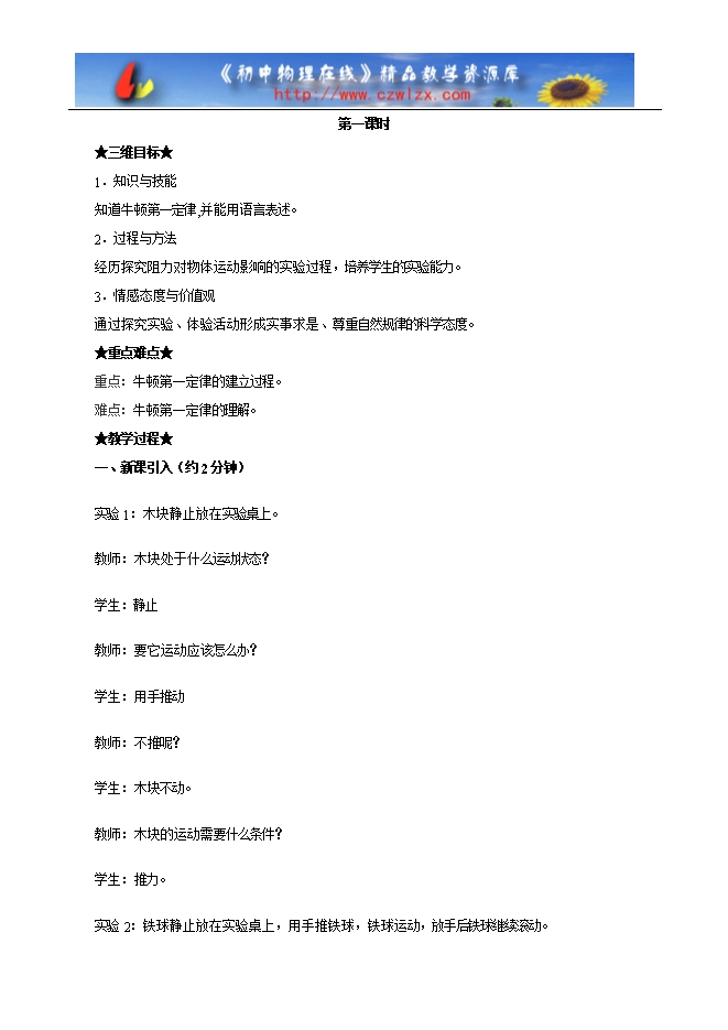 《课程标准》要求学生通过自己的探究来认识“物体都有保持原来静止状态或匀速直线运动状态的性质”,要求学生能用自己的话来表述牛顿第一定律。教材在编写时,将“运动和力的关系”安排在学习了运动和力的基本概念之后,且“运动和力的关系”的内容和方法既是前面所学力学知识的延续,又是后面学习压强、浮力、功和能等知识的基础,牛顿第一定律又是经典力学的核心内容之一,因此本节是全章的重点和难点。