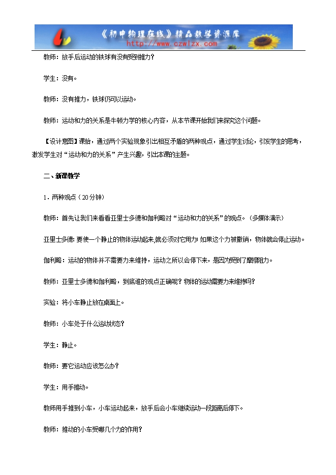 新课的引入在本节教学中非常重要,通过实验引入,可以激发学生探究实验的兴趣;探究阻力对物体运动的影响是一个比较完整的探究实验,教学时重点应放在设计实验和进行实验分析论证等环节上,通过教师的合理引导,发挥学生的主导作用,培养学生的设计能力;惯性现象的认识和解释是培养学生思维能力和语言表达能力的好环节,教师应留足时间让学生思考和表述。