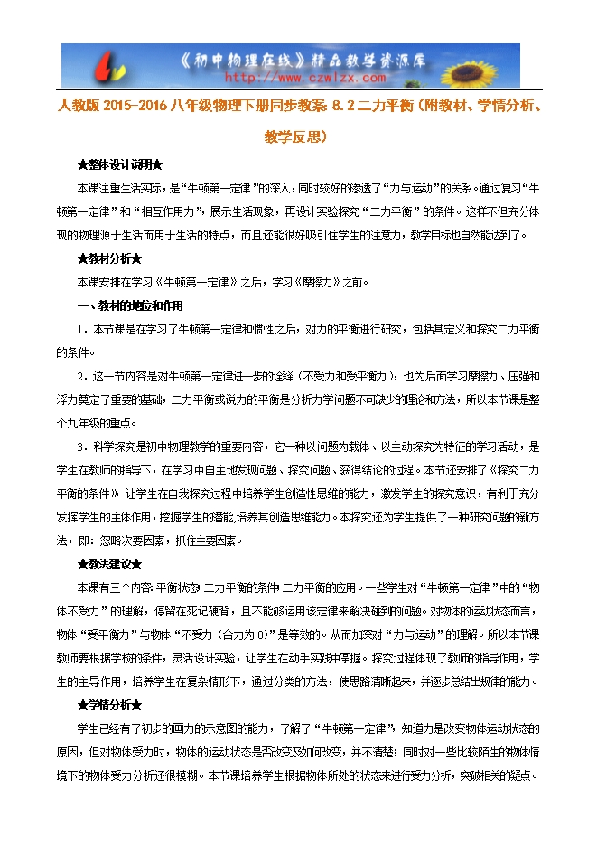 人教版2015-2016八年级物理下册同步教案:8.2二力平衡(附教材、学情分析、教学反思)